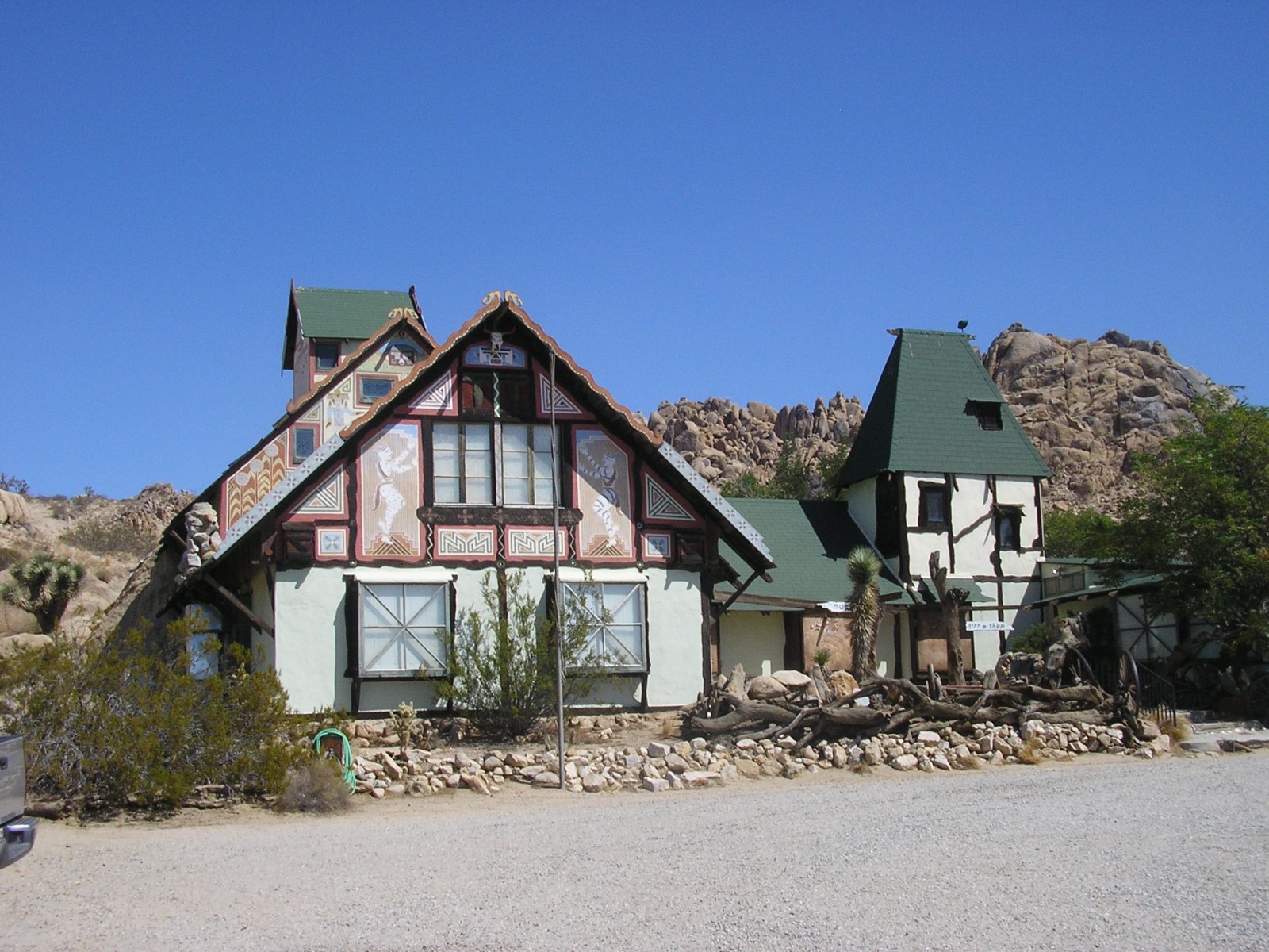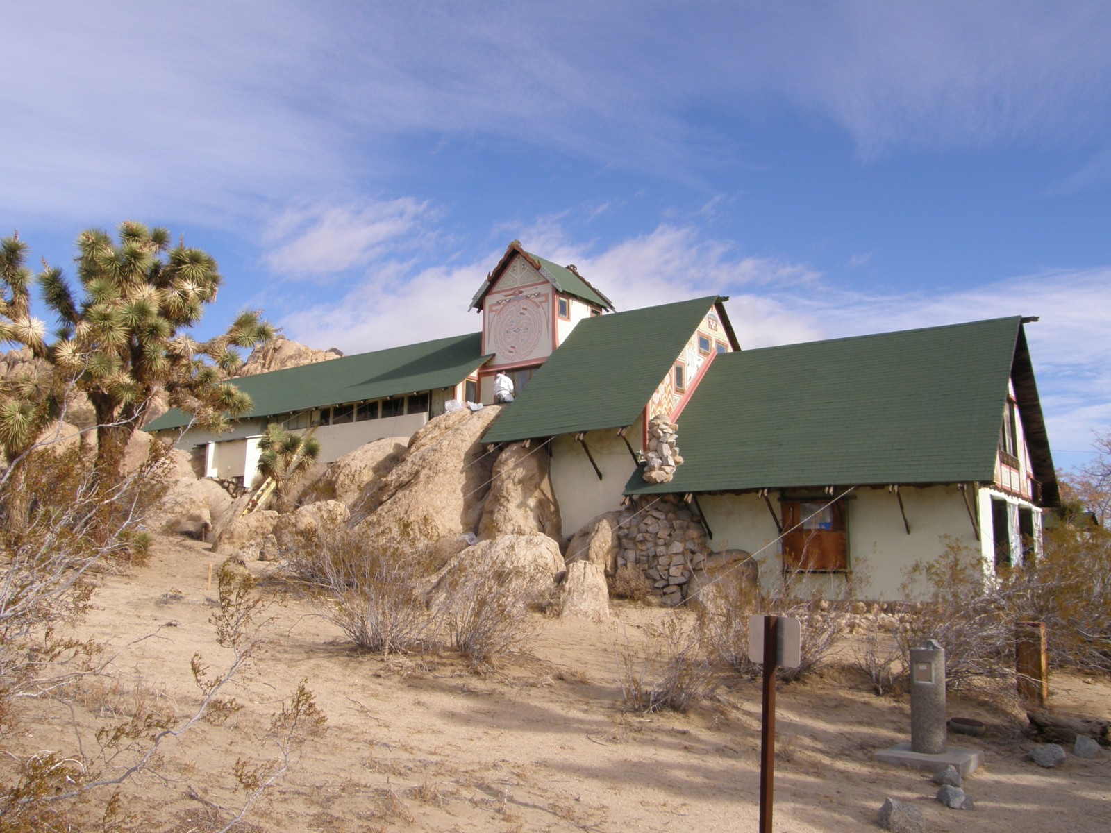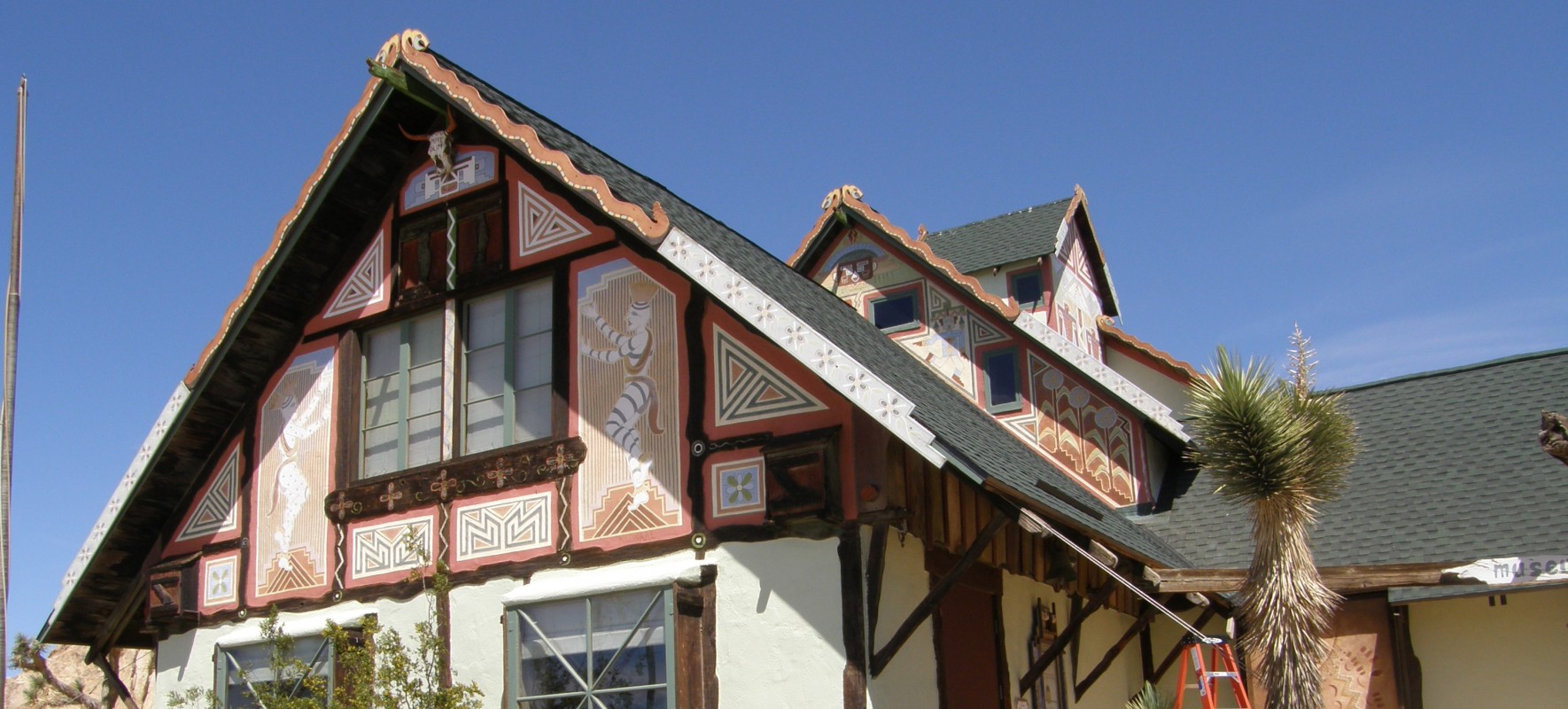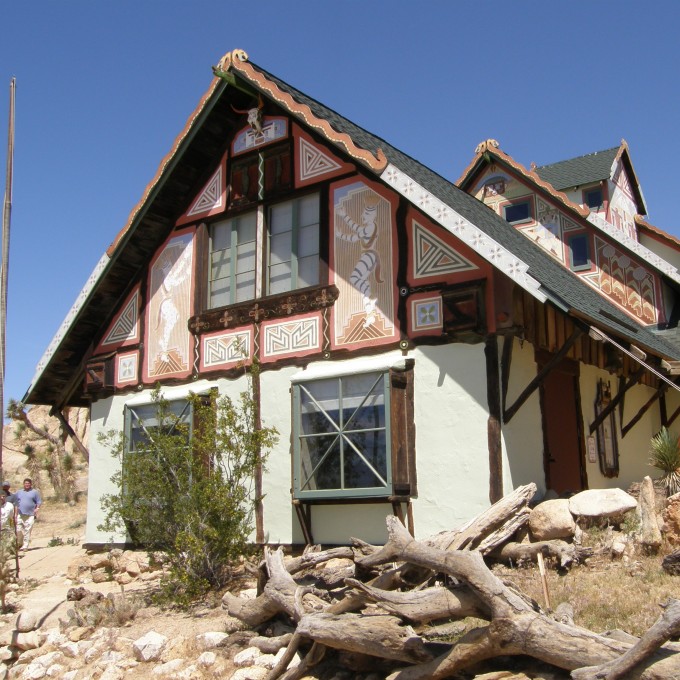 Built in 1928, the Antelope Valley Indian Museum is a mostly one-story, wood-framed structure located in the Mojave Desert. The museum was designed by H. Arden Edwards to house Native American artwork, artifacts, and historic documentation. The chalet-style building, along with its surrounding grounds, is listed on the National Register of Historic Places.