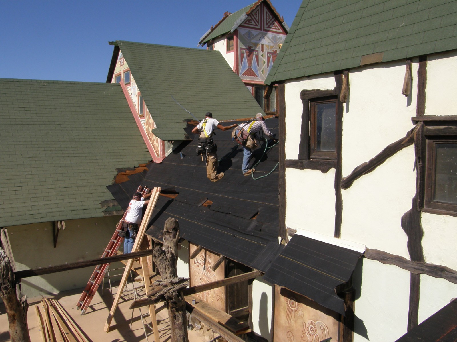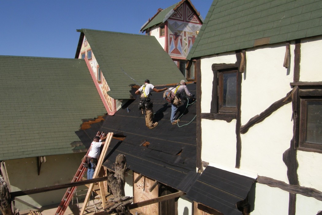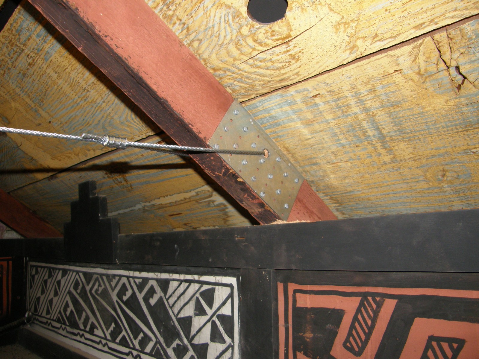 Since the structure typically could not be insulated from the interior due to the presence of historic artwork on the underside of the exposed roof sheathing, insulation had to be added from the outside. Blown-in insulation was added to the walls where interior historic finishes were present, and batt insulation was added to walls where the interior finishes were not historic and could be easily removed and reset. Old, inefficient swamp coolers were removed and replaced with new energy-efficient heat exchangers. To preserve the collection, two humidifiers were also added to help keep the ambient humidity in the museum at optimum levels.