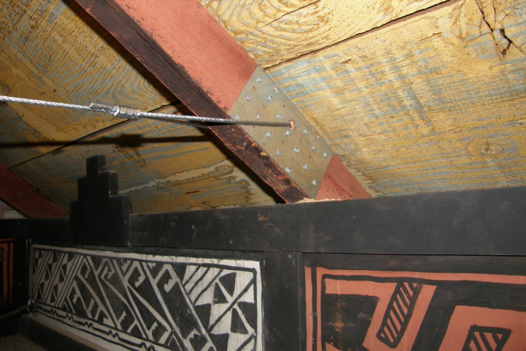 The addition of insulation and associated wood framing and sheathing to the roof of the museum nearly doubled the weight of this minimally framed structure. As the interior finishes were actually exposed structural elements, structural strengthening methods were carefully weighed against the potential impacts on the historic fabric and against the cost of the work. After considering a number of approaches, an unusual arrangement of horizontal internal wire ropes to increase the vertical load capacity of the gabled roof areas and angled and inclined external stainless steel wire ropes to provide increased lateral stability was selected. WJE's role in this project was publically recognized with the California Preservation Foundation's Preservation Design Award and the Los Angeles Conservancy's prestigious Preservation Award.