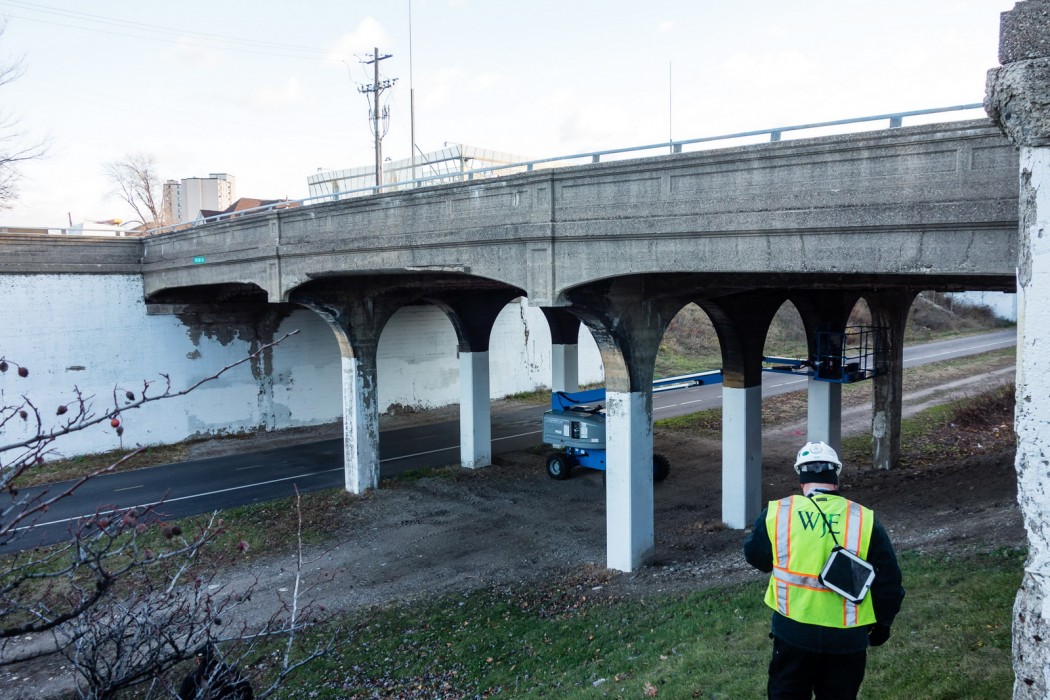 WJE was retained by Hennepin County to assess and analyze structural condition data and to participate in detailed field investigation of existing conditions of the two bridges. Collins Engineers, Inc. was retained by the County to perform an in-depth bridge inspection. Braun Intertec Corporation was retained to perform on-site nondestructive testing, sample removal, and laboratory testing. WJE worked with the County, Collins, and Braun to coordinate the inspection, help define the testing procedures and locations, and interpret the results.