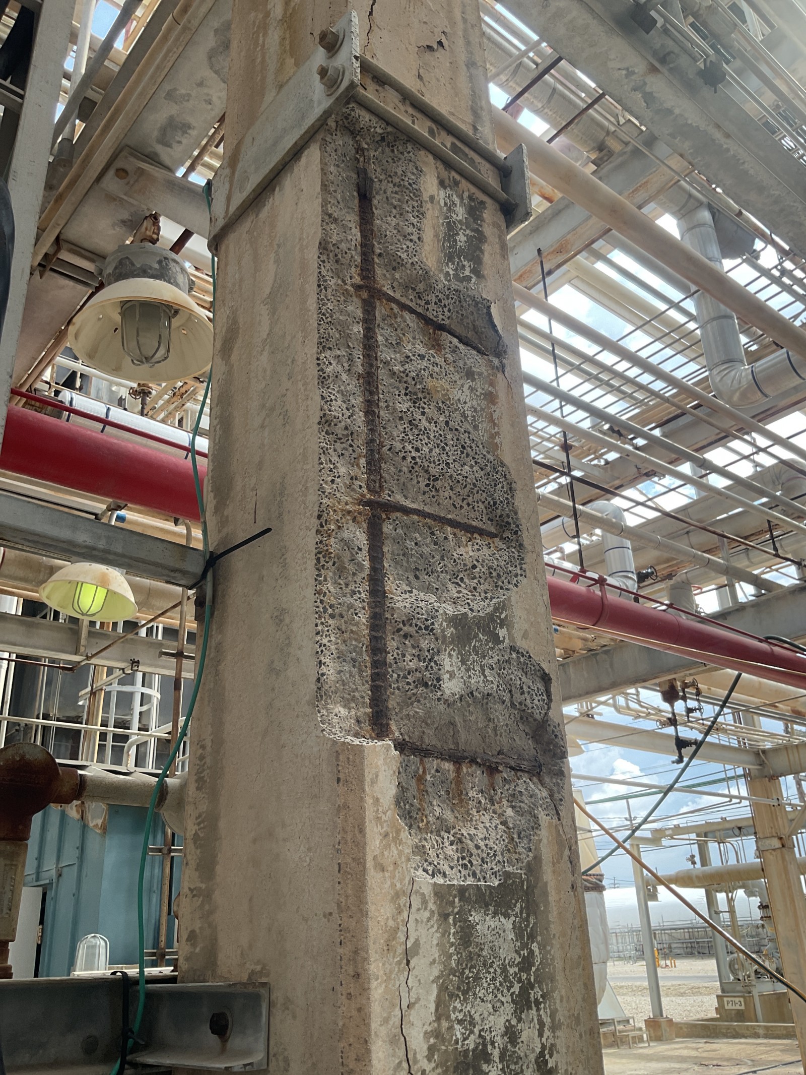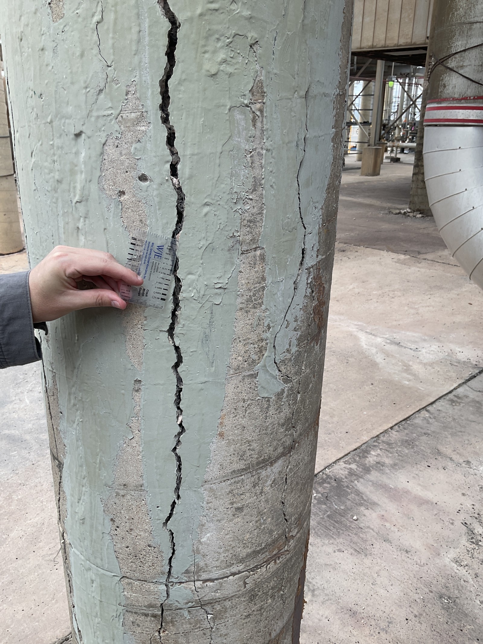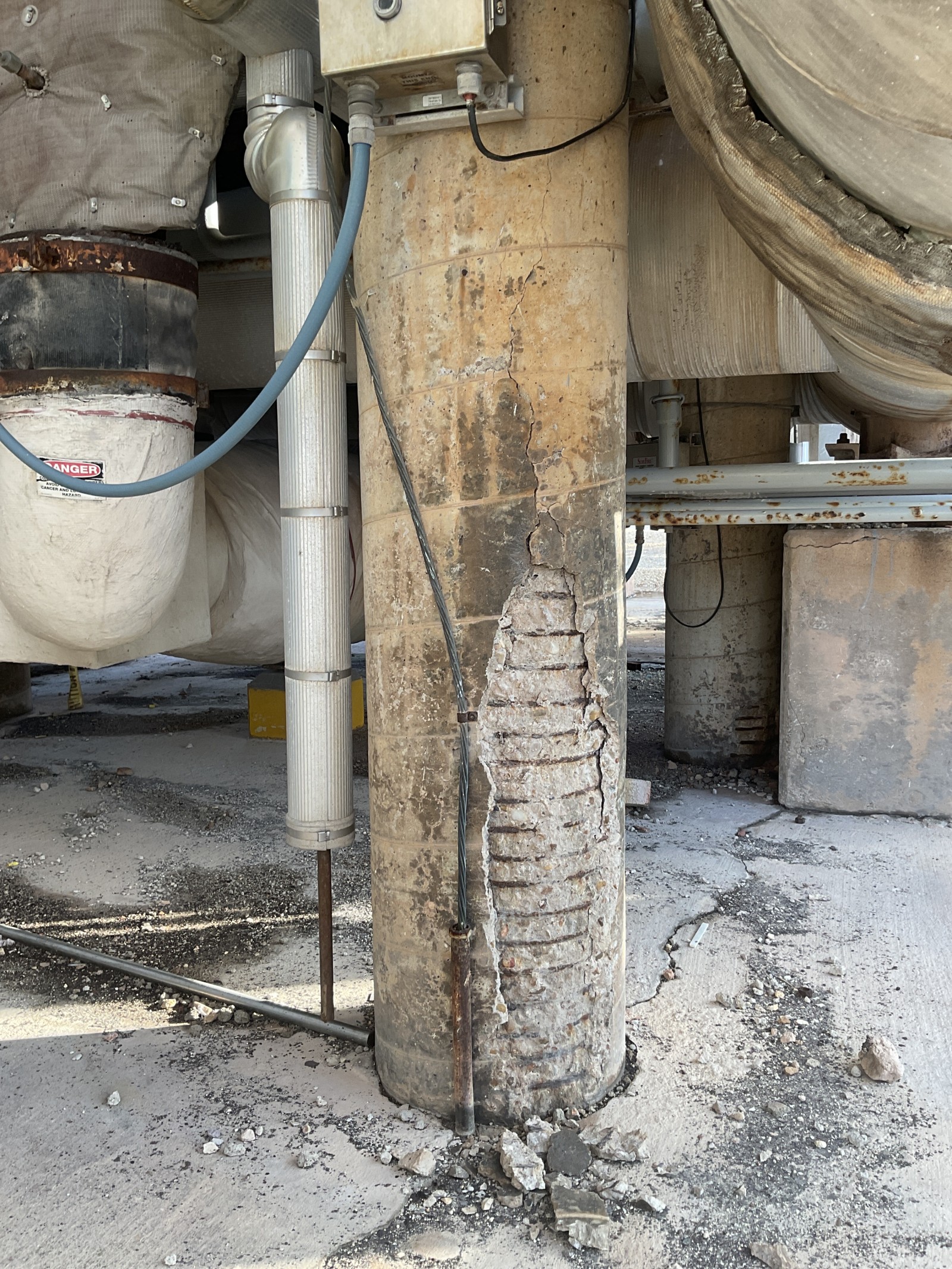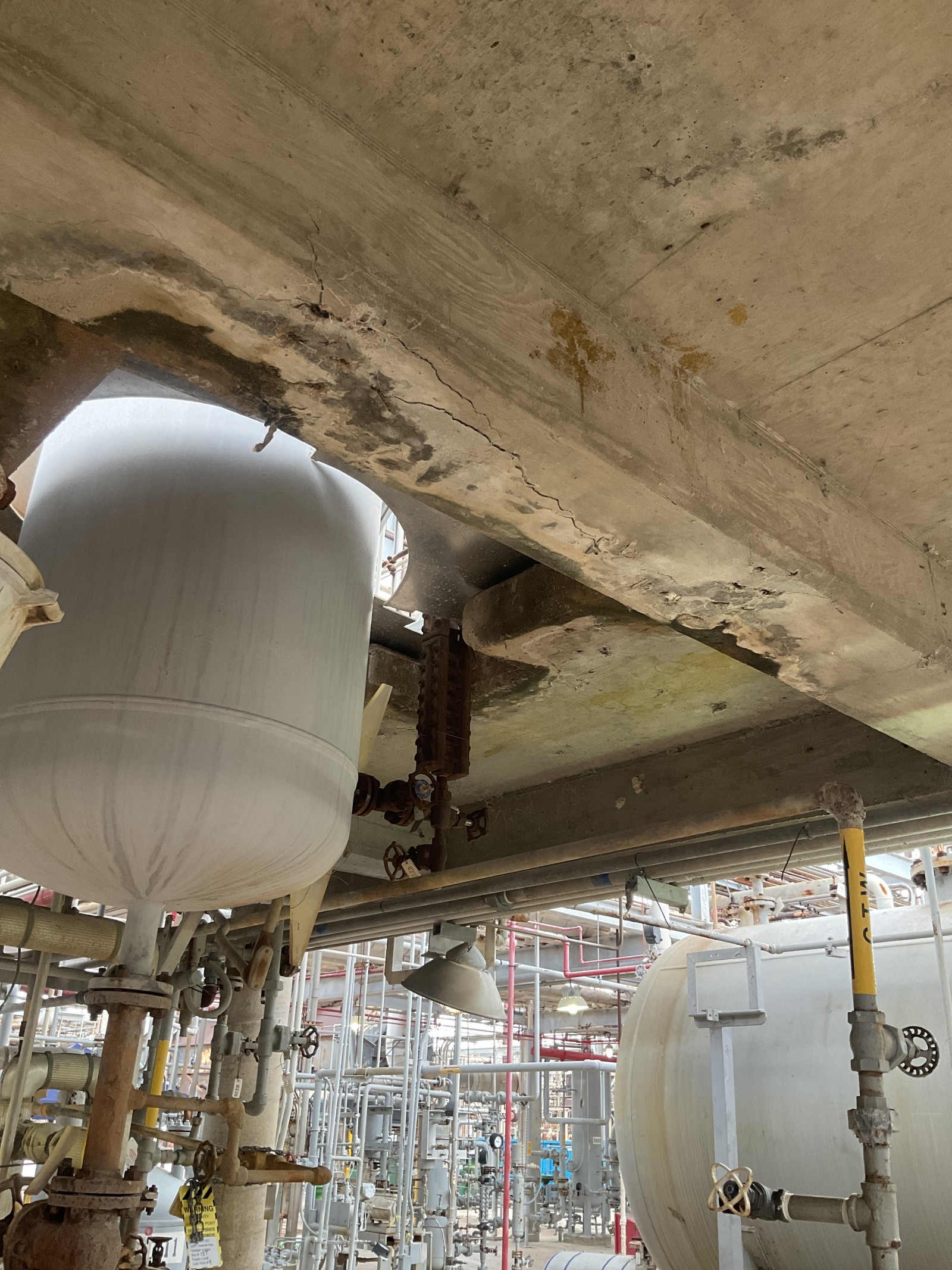 WJE mobilized a team of structural engineers with experience in assessing concrete structures in process facilities to the site. We performed a visual assessment throughout the unit and performed acoustical sounding at selected locations to better understand the extent of deterioration.