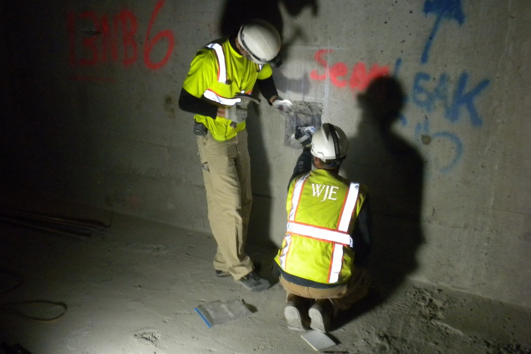 The visual inspection and acoustic sounding surveys allowed WJE to focus the nondestructive testing and inspection openings on areas of the bridges that exhibited conditions indicative of post-tensioning distress. After identifying the areas of potential concern (cracks, spalls, and delaminations), WJE installed drill-hole and large inspection openings. The drill-hole openings allowed for documentation of conditions inside the ducts. The large inspection openings allowed for duct interior observations as well as grout sampling. The inspection openings identified grout voids and prestressing strand corrosion. Grout and concrete materials testing did not identify any deleterious activities.