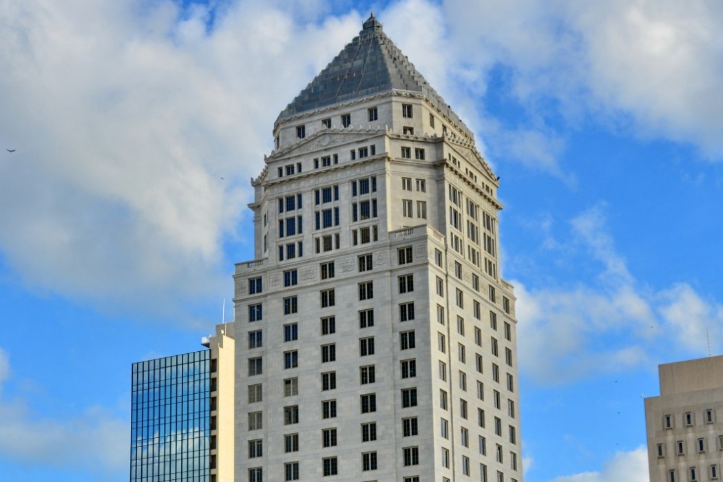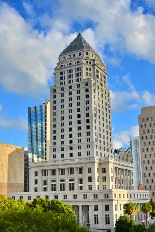 Built in 1928, the Miami-Dade County Courthouse is 360 feet tall and was the first high-rise building constructed in Miami for the County. For decades after construction, it was known as the tallest building south of Baltimore. The building is in the art deco style of South Florida and is clad in terra cotta with a granite base. The plaza encompasses nearly a square city block and includes granite and slate paving. The building was added to the National Register of Historic Places in 1989.