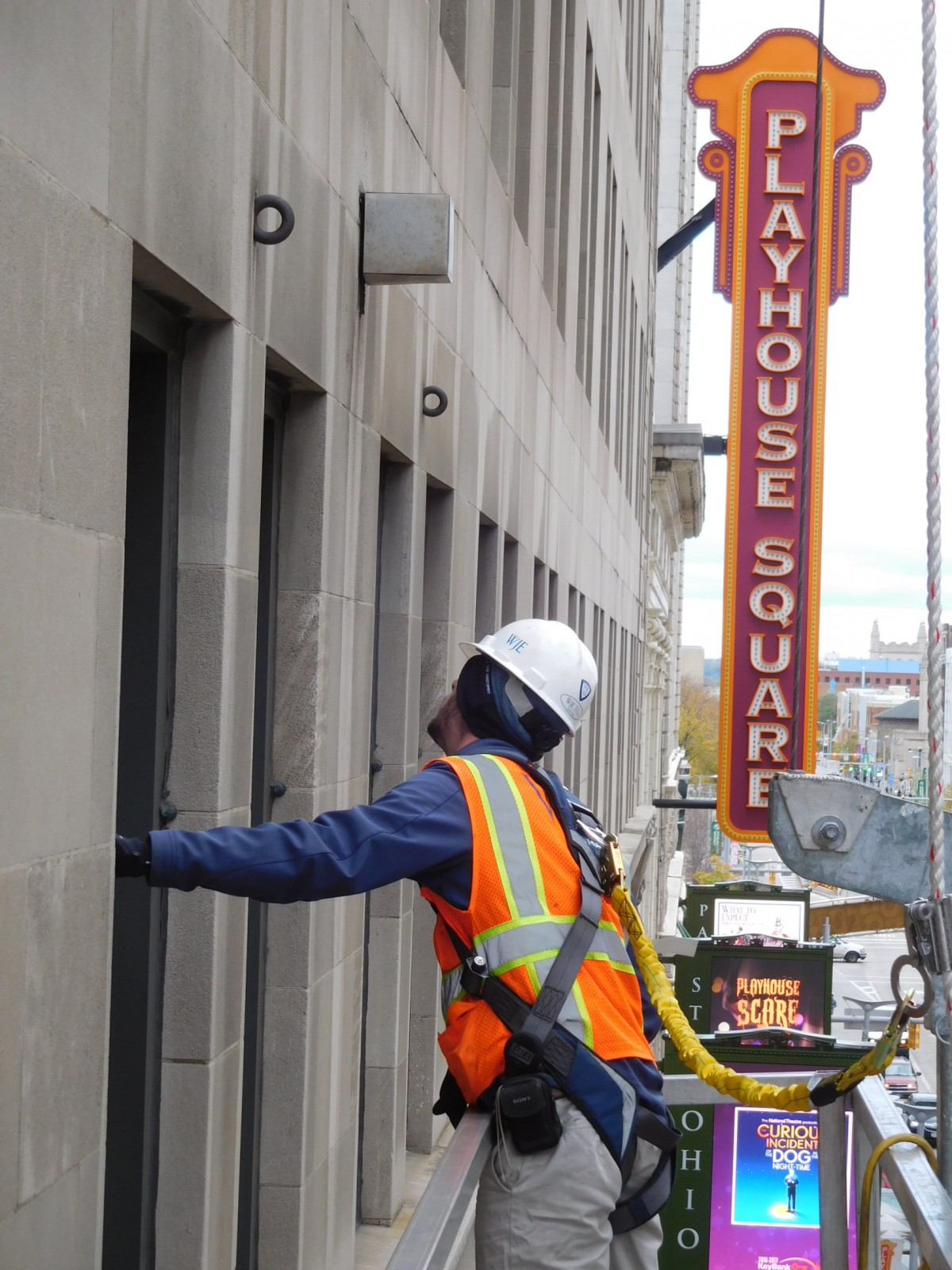 WJE’s services included a Facade Ordinance inspection of each building to document deficiencies found on the exterior walls and appurtenances (i.e., marquee signs) and categorize those conditions as either “safe,” “unsafe,” or “safe with a repair and maintenance program.” WJE’s inspection of the facades consisted of visual observations using binoculars from grade level and roof levels and at arm’s length from suspended scaffolding. Removal of brick masonry permitted assessment of concealed conditions, such as steel lintels and backup material.