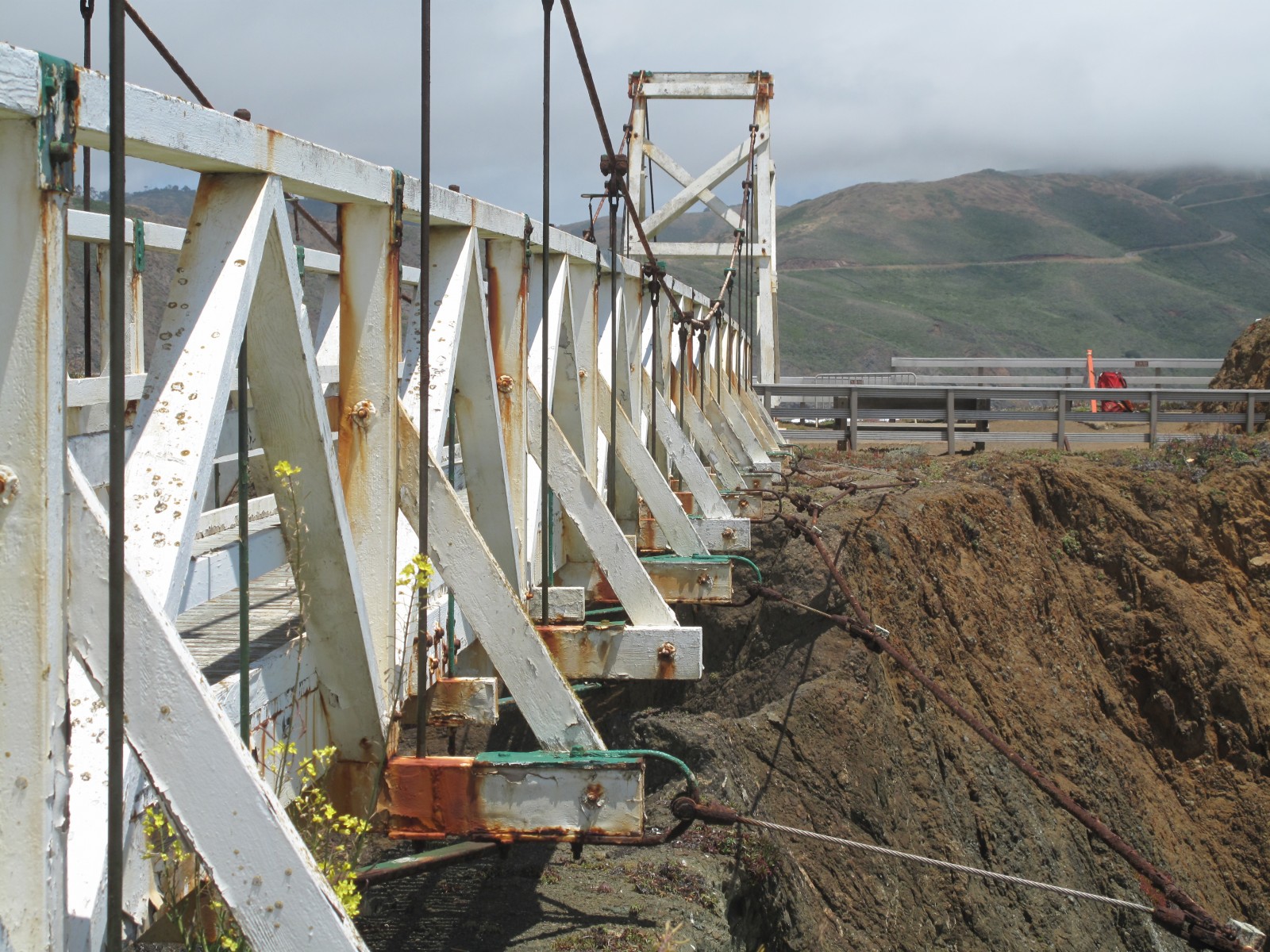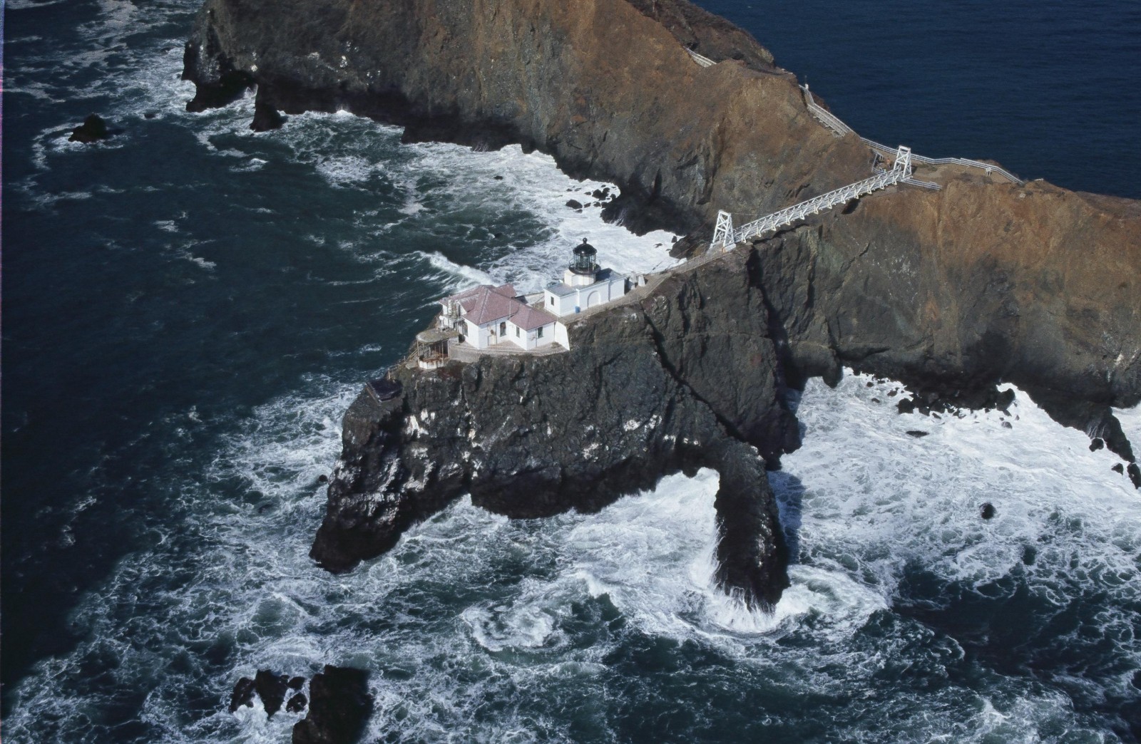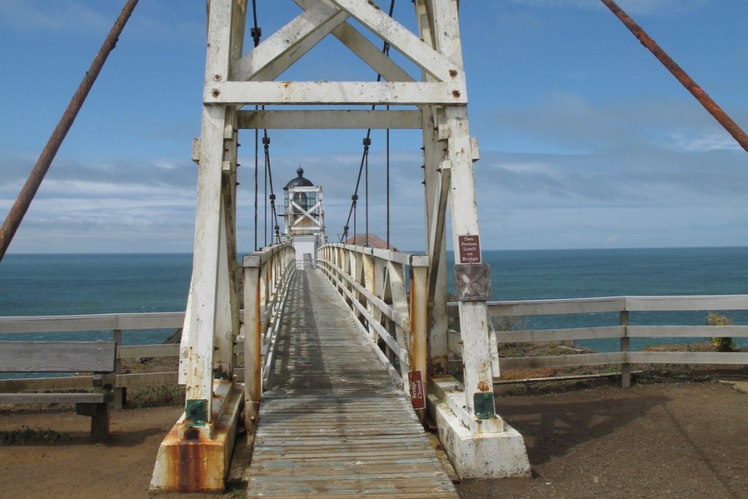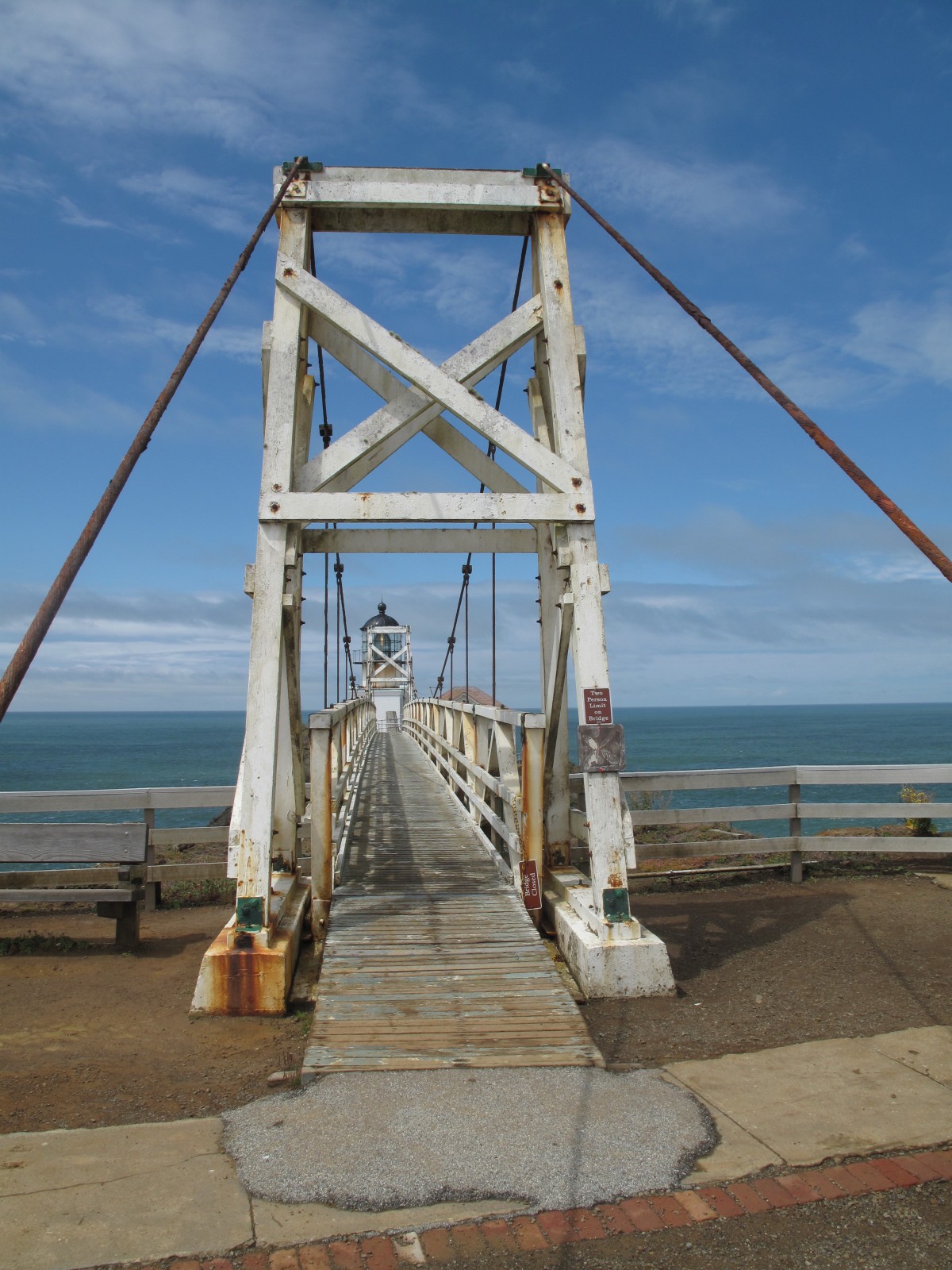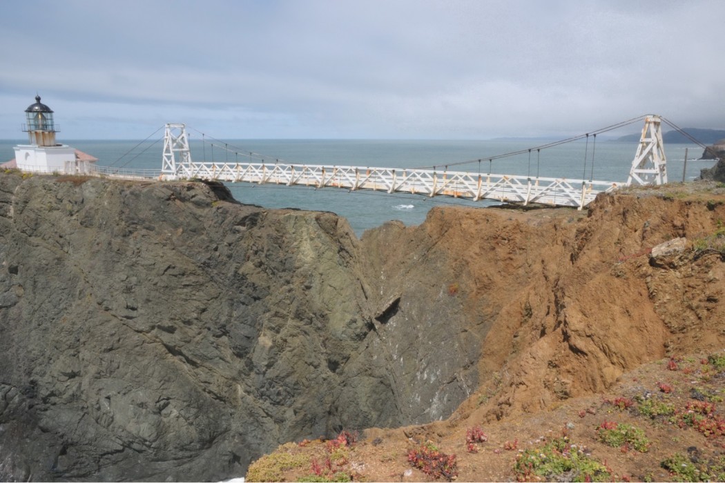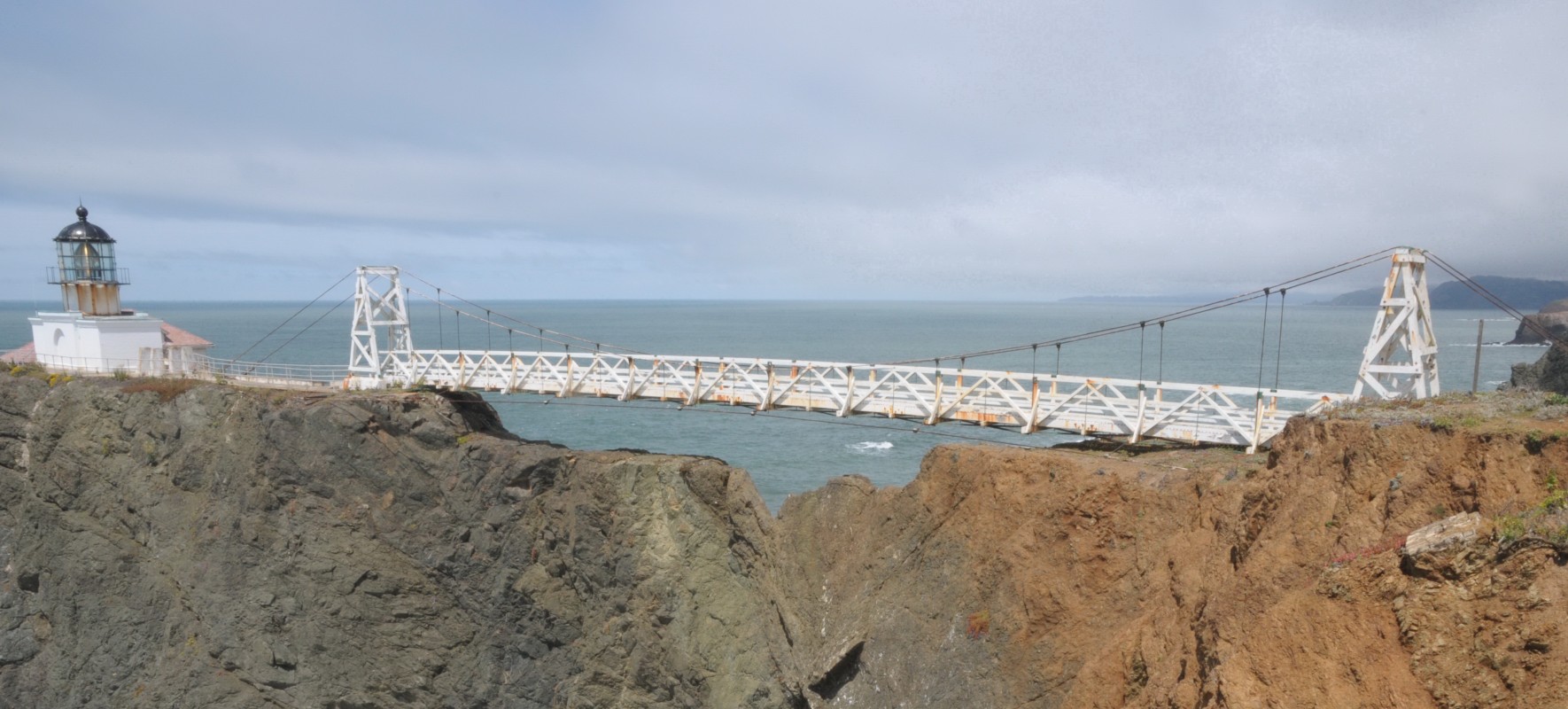 A suspension bridge was constructed in 1954 after a series of landslides caused a 150-foot section of the original land bridge to slough away, isolating the lighthouse and fog signal from the mainland. The suspension bridge provides the only access to these facilities.