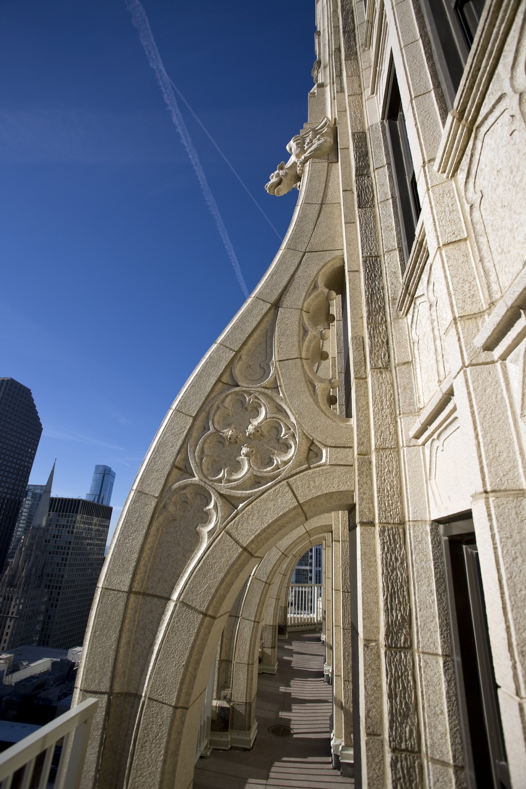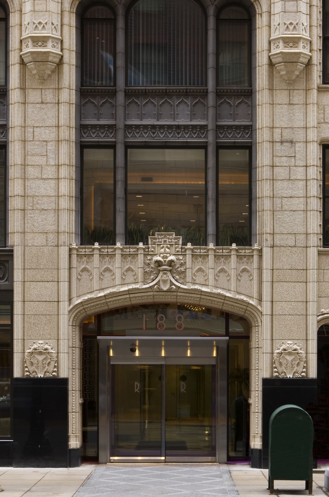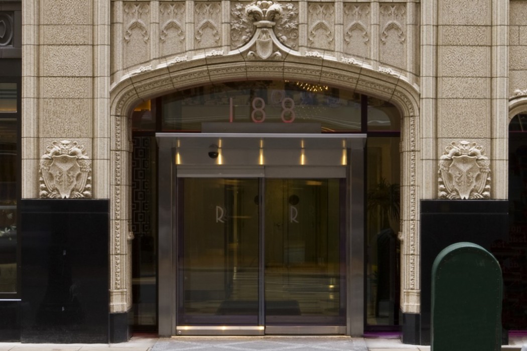 Two noteworthy features that were restored were the large, projecting terra cotta gargoyles at the thirty-ninth floor and the entire first floor storefront. Removed in the 1960s, new terra cotta gargoyles were sculpted based upon historic photographs. The retail storefront restoration included removal of the 1950s granite panels and complete recreation of the original, ornate terra cotta. Craftsmen from the terra cotta manufacturer recreated all of the intricate ornamentation taken from the original 1928 terra cotta shop drawings. The adaptive reuse of the interior combined historic restoration with contemporary design features inspired by the building's historical motifs and Jazz Era context.