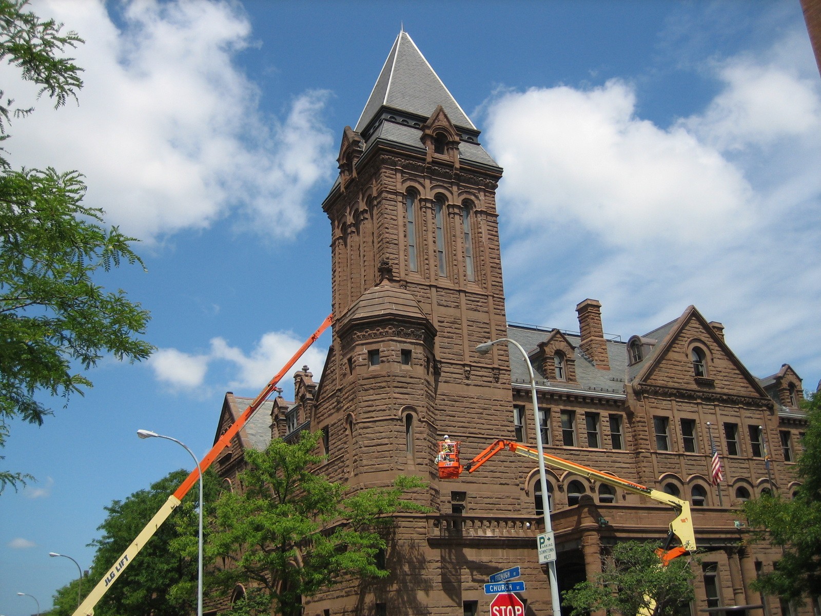 Rochester City Hall was constructed in 1885—1889 as a federal courthouse and post office, designed in the Romanesque style. The building is listed on the National Register of Historic Buildings. It is one of the contributing historic structures in a city with a rich architectural detailing. It was designed with masonry bearing wall construction and steel interior framing. The facade of the building is composed of sandstone, a layered sedimentary rock (arkosic sandstone) that was reportedly quarried in the Hartford Basin in Connecticut.