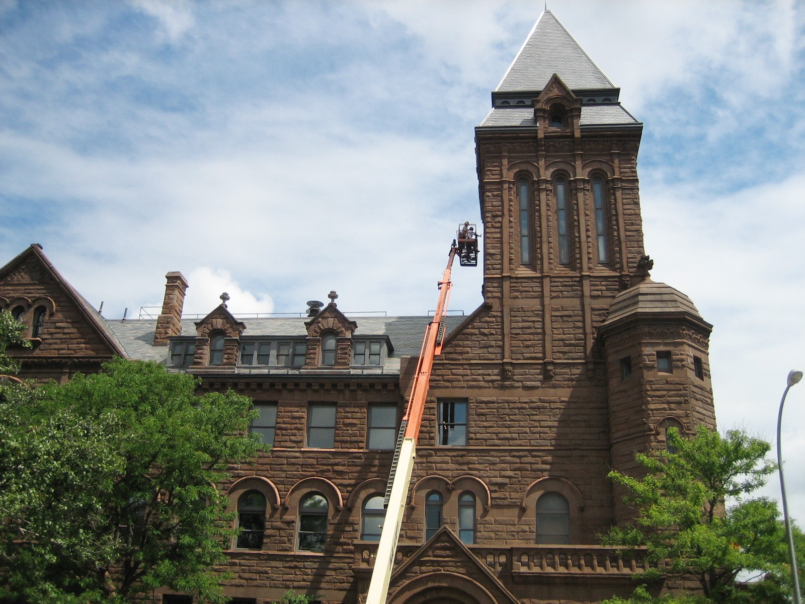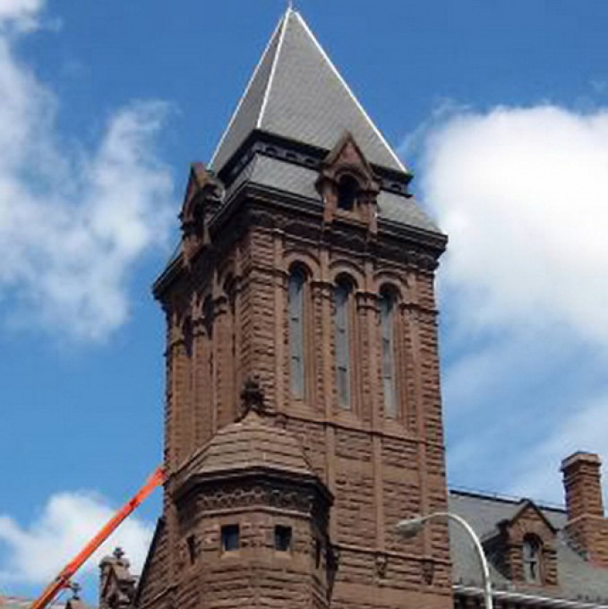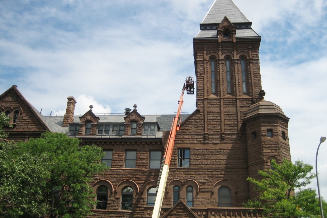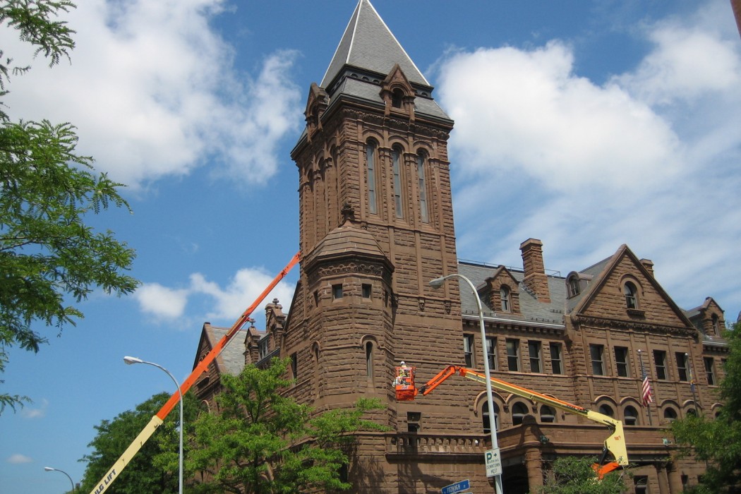 Mesick Cohen Wilson Baker Architects (MCWBA) retained WJE to evaluate and make recommendations for restoration of the existing sandstone masonry as well as building mortar for the exterior of the city hall. The City of Rochester sought procurement to rehabilitate the masonry of the entire exterior envelope of the city hall. The scope of work also included cleaning and selective replacement of the masonry and consolidation of ornate architectural detail.