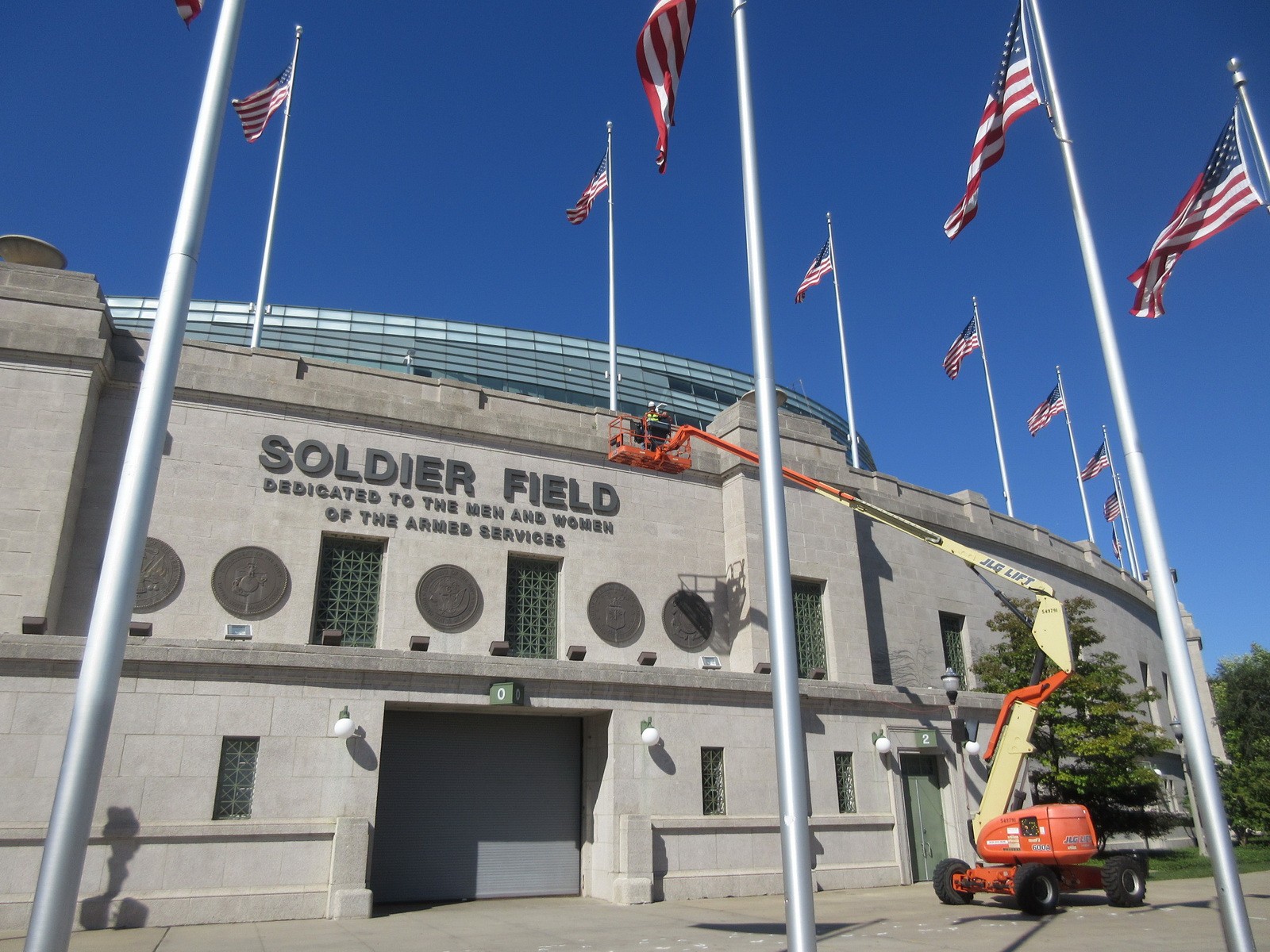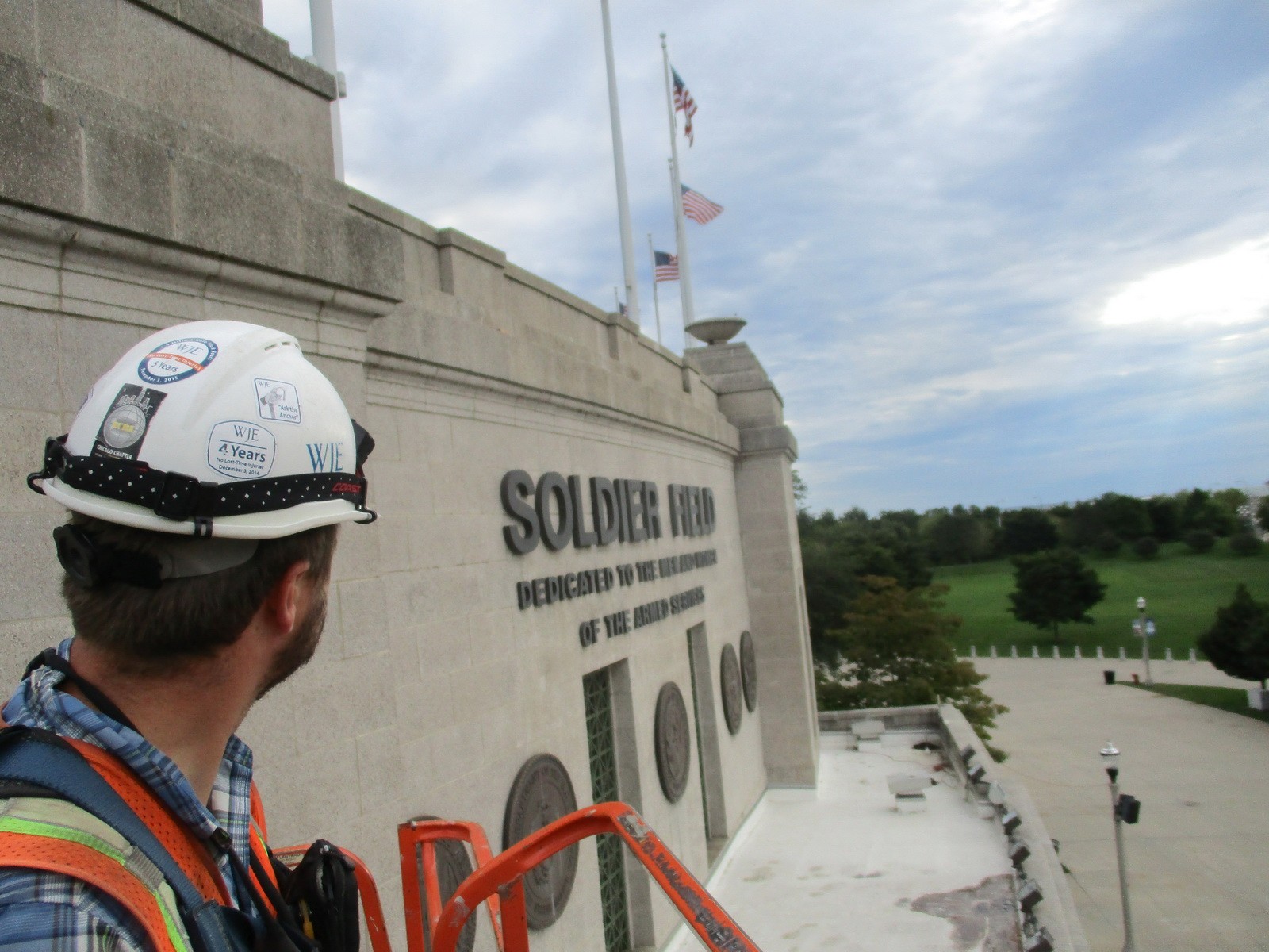 Soldier Field was originally constructed in 1925-26 and dedicated in honor of the soldiers of World War I. The colonnades were constructed of precast and cast-in-place concrete formulated to resemble granite. The concourses and grandstands were constructed of reinforced structural concrete. The original concrete has experienced deterioration over the years due primarily to corrosion of the embedded reinforcing steel from chlorides and carbonation. The stadium underwent a major rehabilitation in 2002-2003 in which the historic perimeter of the stadium was retained, but the interior was replaced with a new stadium structure.