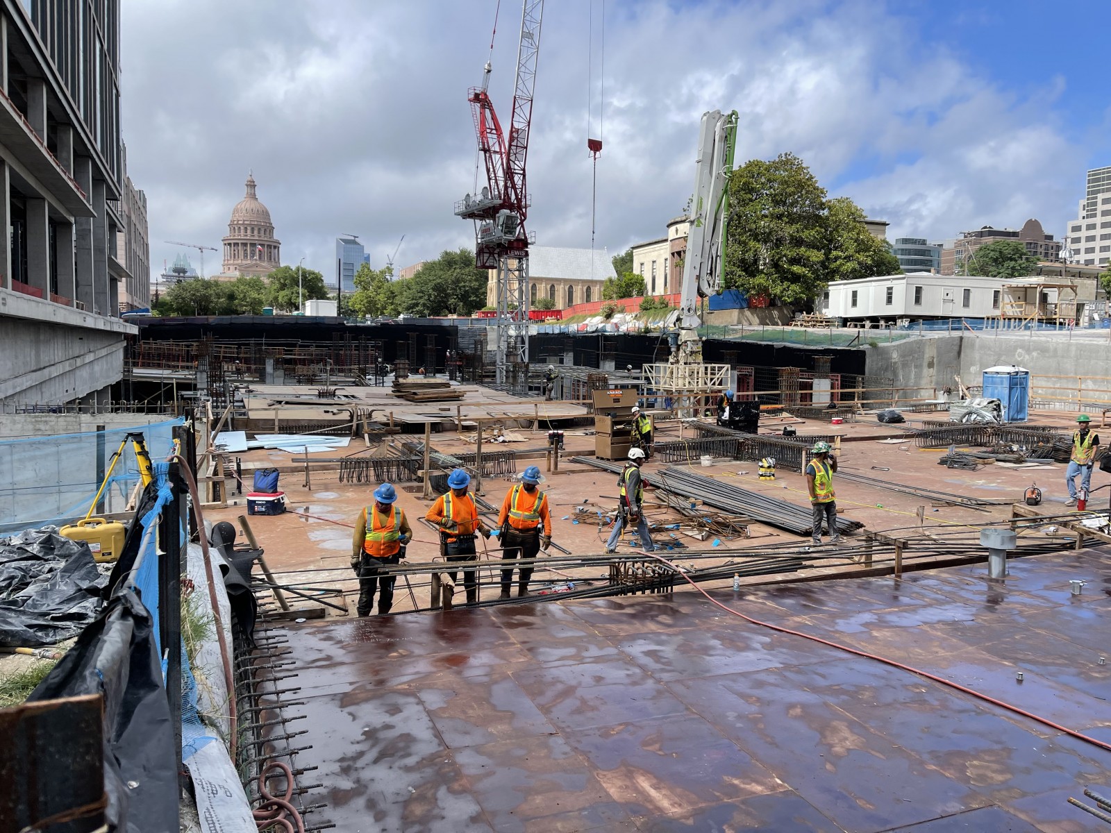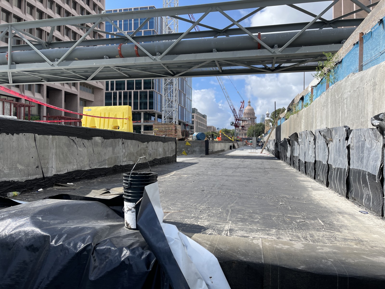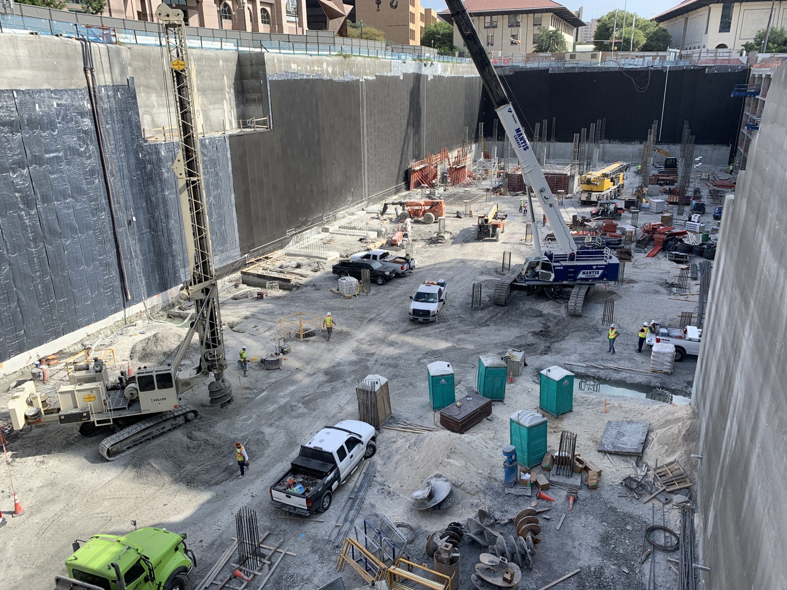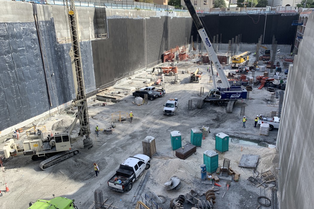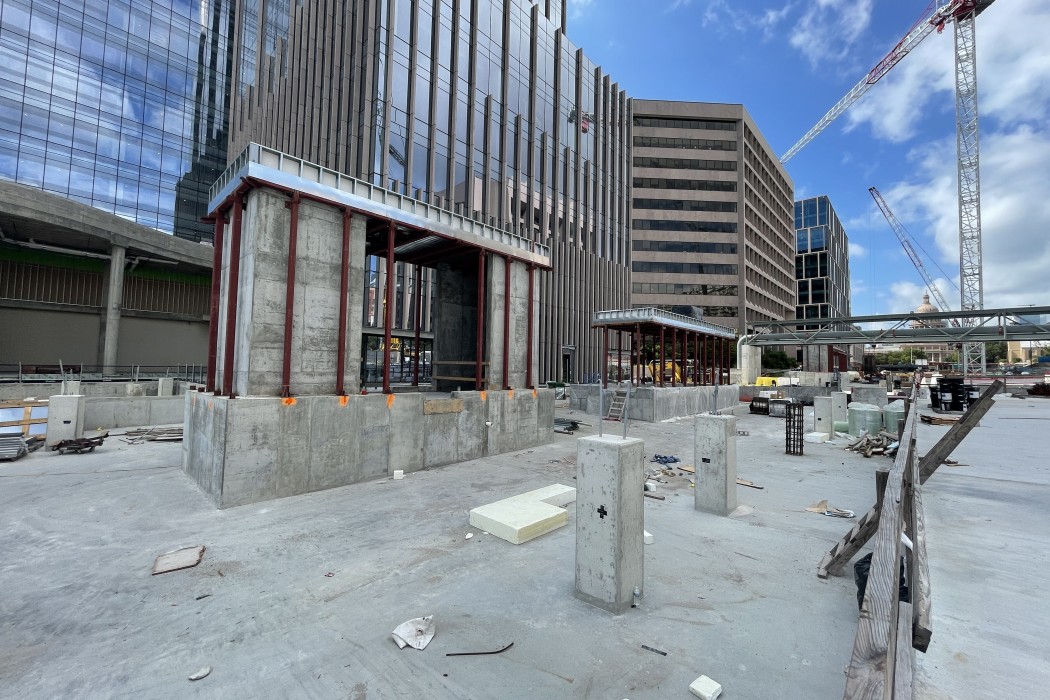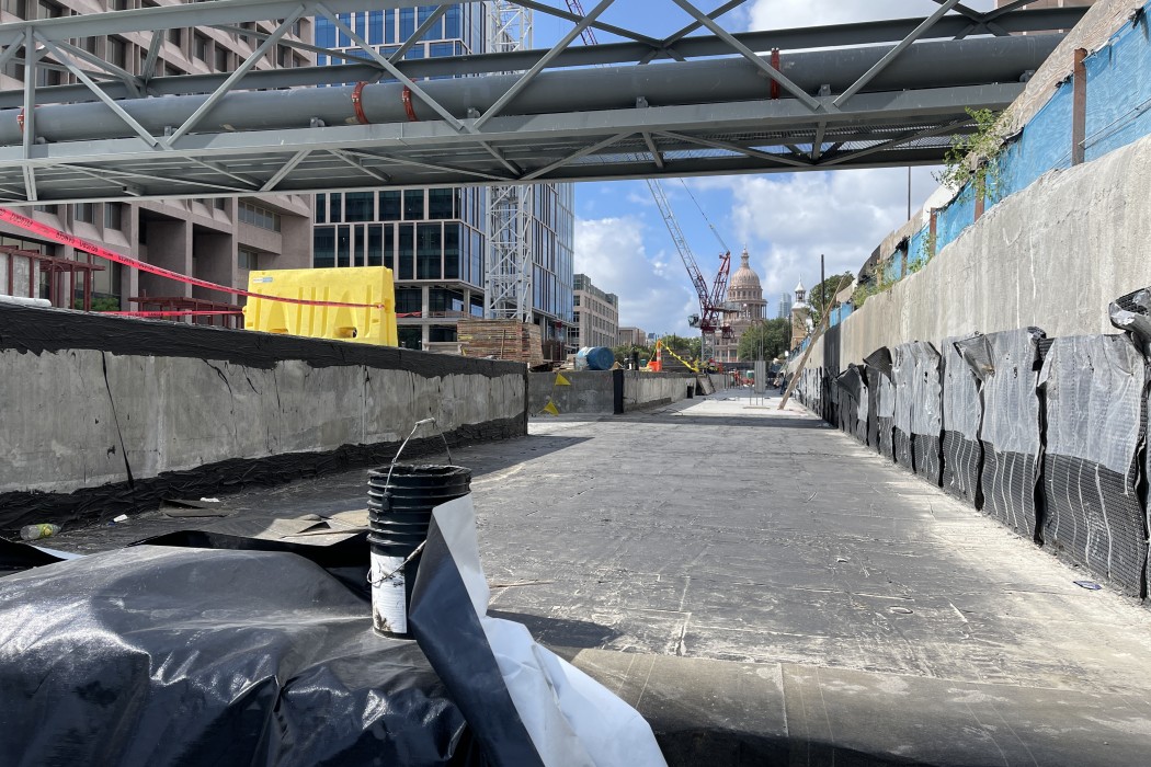 Waterproofing and drainage were primary concerns in the design of the five-story-deep, below-grade parking structure, located at what was once a portion of Congress Avenue. Early in the conceptual design phase, the Master Architect team faced a key decision regarding the waterproofing system to be used. WJE arranged for a visit by the project team to observe installation of the proposed blind-side membrane system being installed at another project that we were working on. The selection of this system affected many downstream decisions.