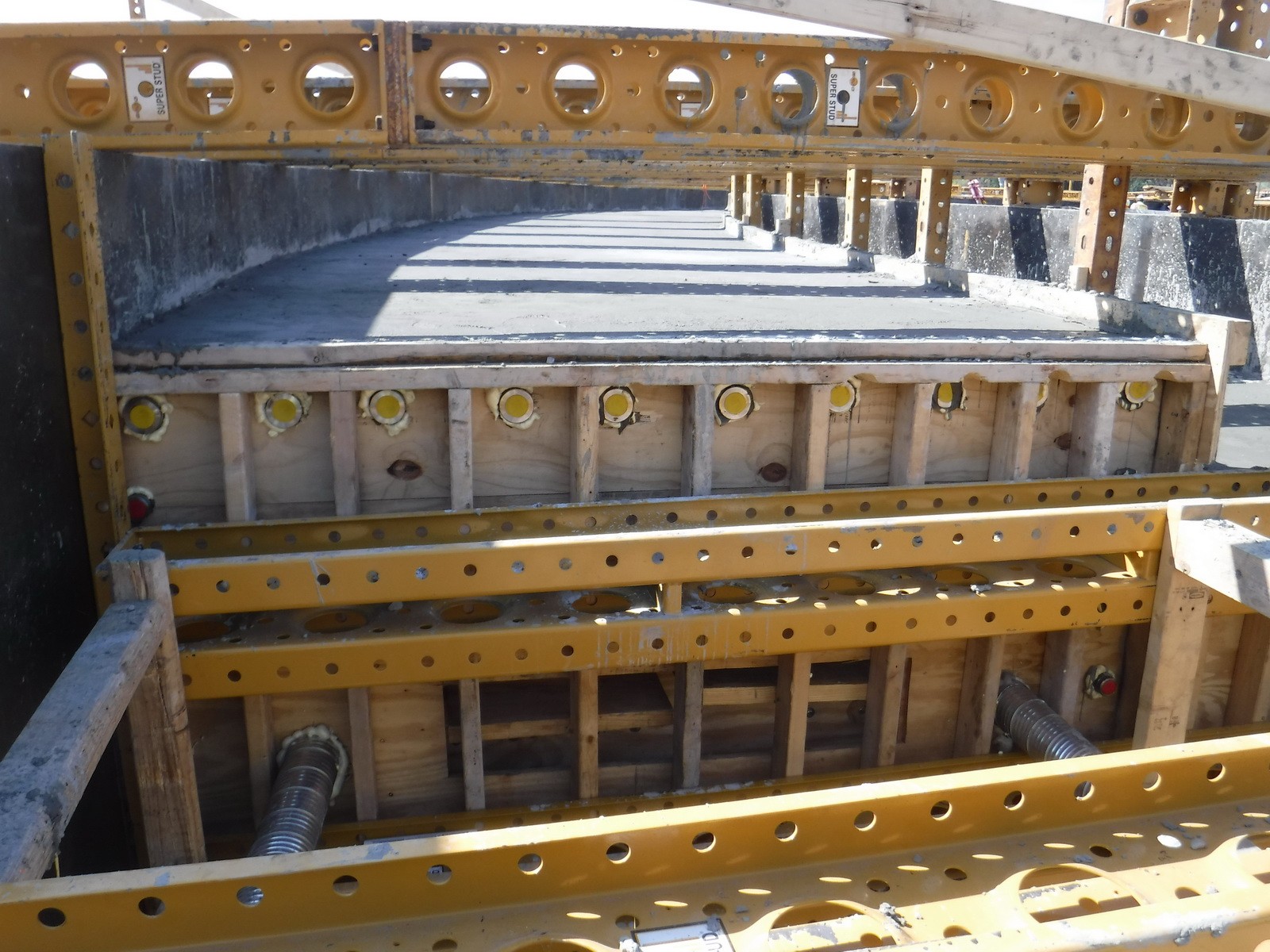 WJE was retained to provide mass concrete consulting services for a post-tensioned concrete cantilevered beam with approximate cross-sectional dimensions of 5 feet by 7 feet. The project concrete specifications required that the maximum allowable internal temperature of mass concrete not exceed 160°F and that the maximum temperature differential between the central core of the placement and the exposed concrete surface not exceed 35°F.